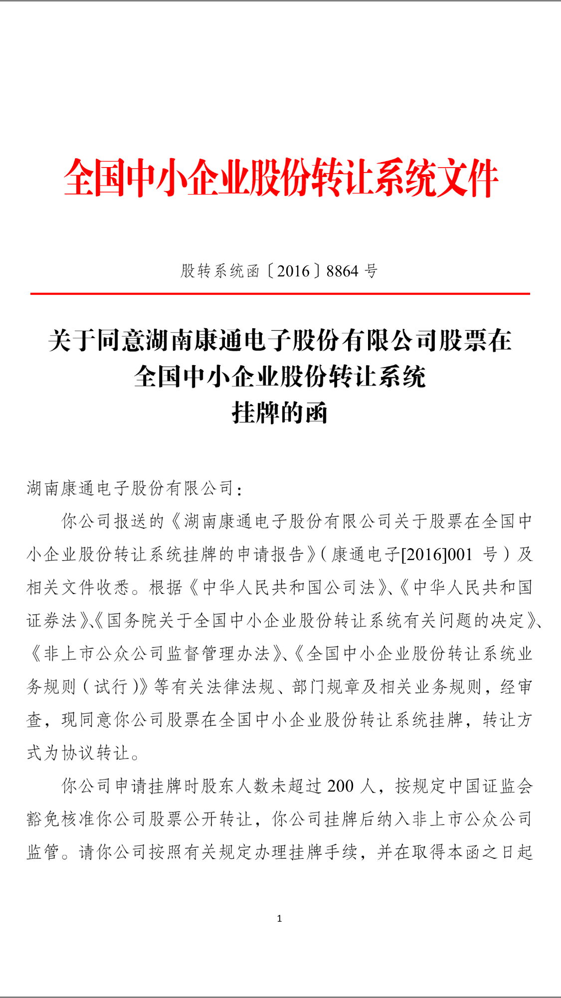 2016年11月30日,湖南康通電子股份有限公司(簡稱“康通電子”),在全國中小企業股份轉讓中心即“新三板”通過審批,正式獲準掛牌,股票代碼:870301。