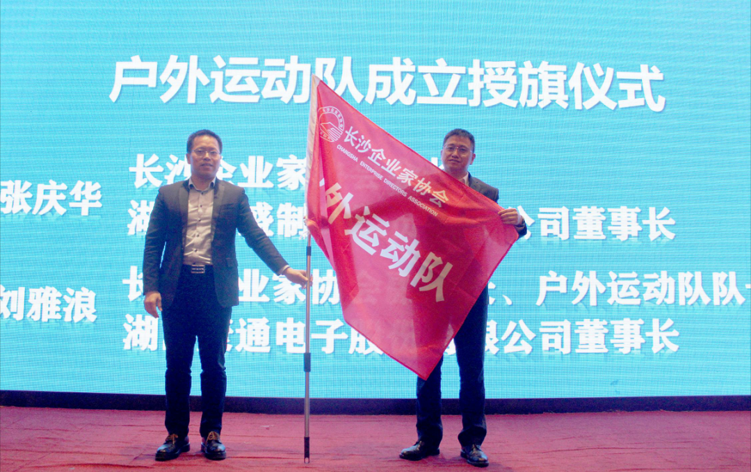 頒獎儀式后,舉行了長沙企業家協會戶外運動隊成立授旗儀式,由協會會長張慶華向協會副會長、戶外運動隊隊長、湖南康通電子股份有限公司董事長劉雅浪授旗。
