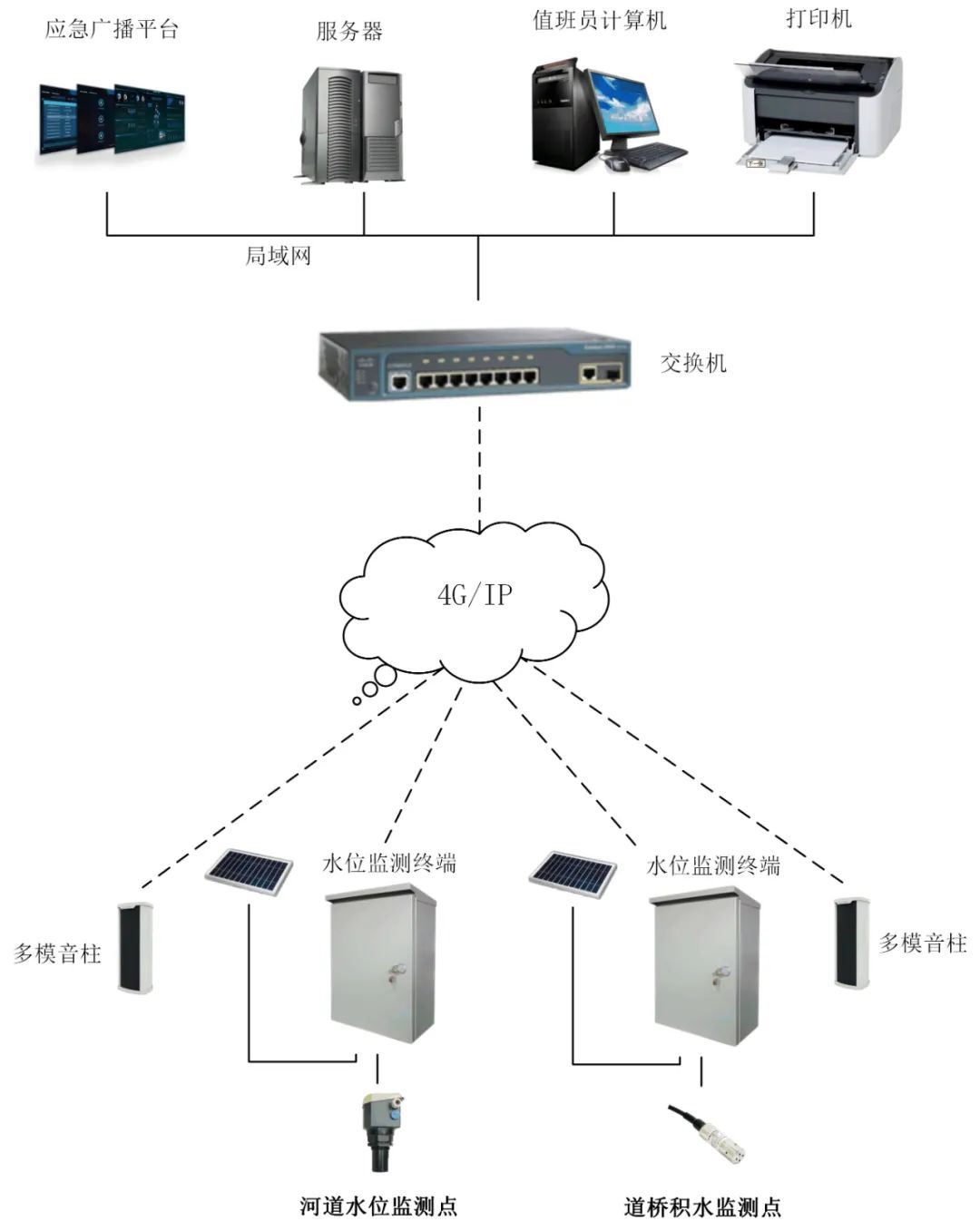 系統(tǒng)采用多級(jí)管控,城市防汛聯(lián)動(dòng)系統(tǒng)負(fù)責(zé)對(duì)整個(gè)區(qū)的內(nèi)澇點(diǎn)進(jìn)行全面的監(jiān)測(cè)和管理,當(dāng)監(jiān)測(cè)終端到達(dá)警戒點(diǎn),城市防汛聯(lián)動(dòng)系統(tǒng)將會(huì)把預(yù)警信息上傳到應(yīng)急廣播平臺(tái)系統(tǒng),可實(shí)現(xiàn)對(duì)相關(guān)區(qū)域的預(yù)警信息播報(bào),以警示來往車輛及周圍居民。