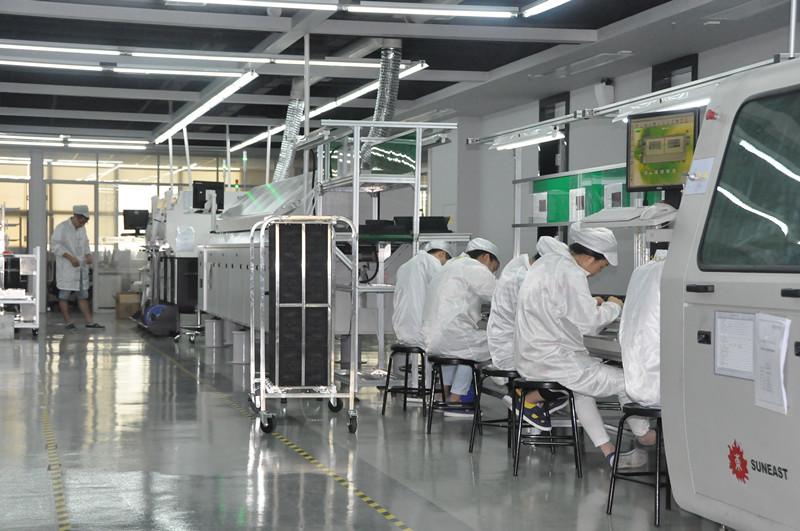 貼片車間生產線目前有1條SMT(表面封裝焊接技術)與DIP(通孔封裝焊接技術)組成。其中SMT設備有全自動上板機1臺,全自動傳送接駁設備3臺,GKG全自動印刷機1臺,Panasonic-AM100高速貼片機2臺,JTE全自動熱風回流焊爐1臺,錫膏攪拌機1臺及全自動烘箱1臺組成;DIP設備有全自動插件線2條,日東全自動波峰焊接爐1臺,全自動出板接駁設備1臺,電容成型機1臺及電阻成型機1臺;周邊輔助設備空壓機1臺,冷干機1臺及風機1臺。